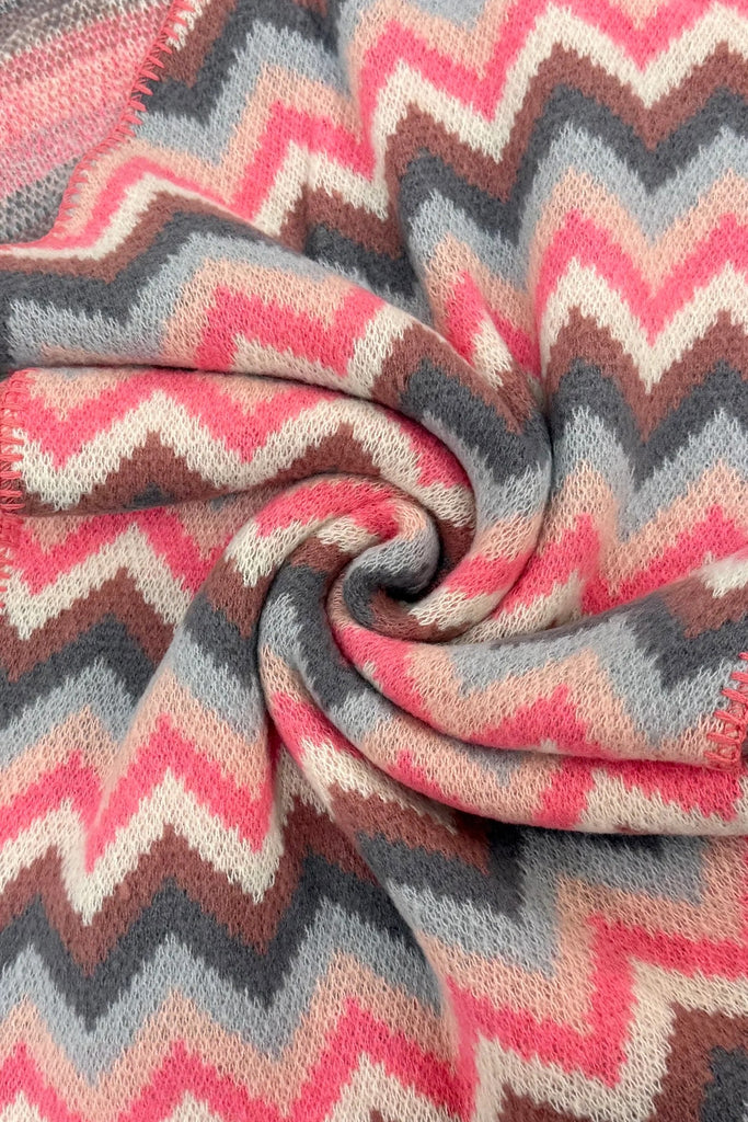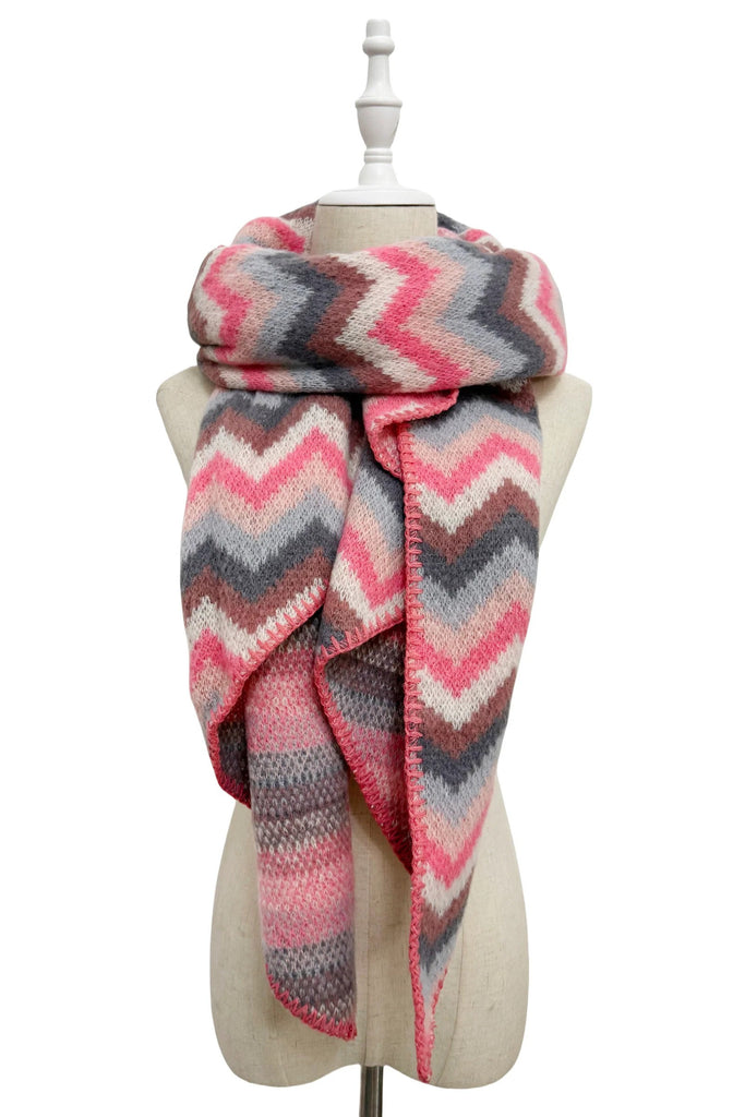 Textured wool-mix in pretty pink and pale grey chevron stripes, complete with a timeless blanket-stitch finish.