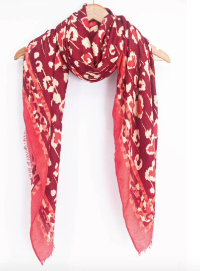 A striking mix of red and stone leopard print with gold highlights, set against a burgundy background and finished with a striped edge for a polished, contemporary touch.